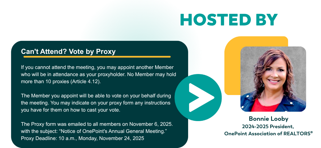 A photographer may be on-site at this event, and may take posed or candid shots of presenters, delegates and the audience. These images may be used in the OnePoint Association of REALTORS®'s websites and promotional material. By registering for the event you are consenting to the use of photographs which become the property of OnePoint Association of REALTORS® (the event host).